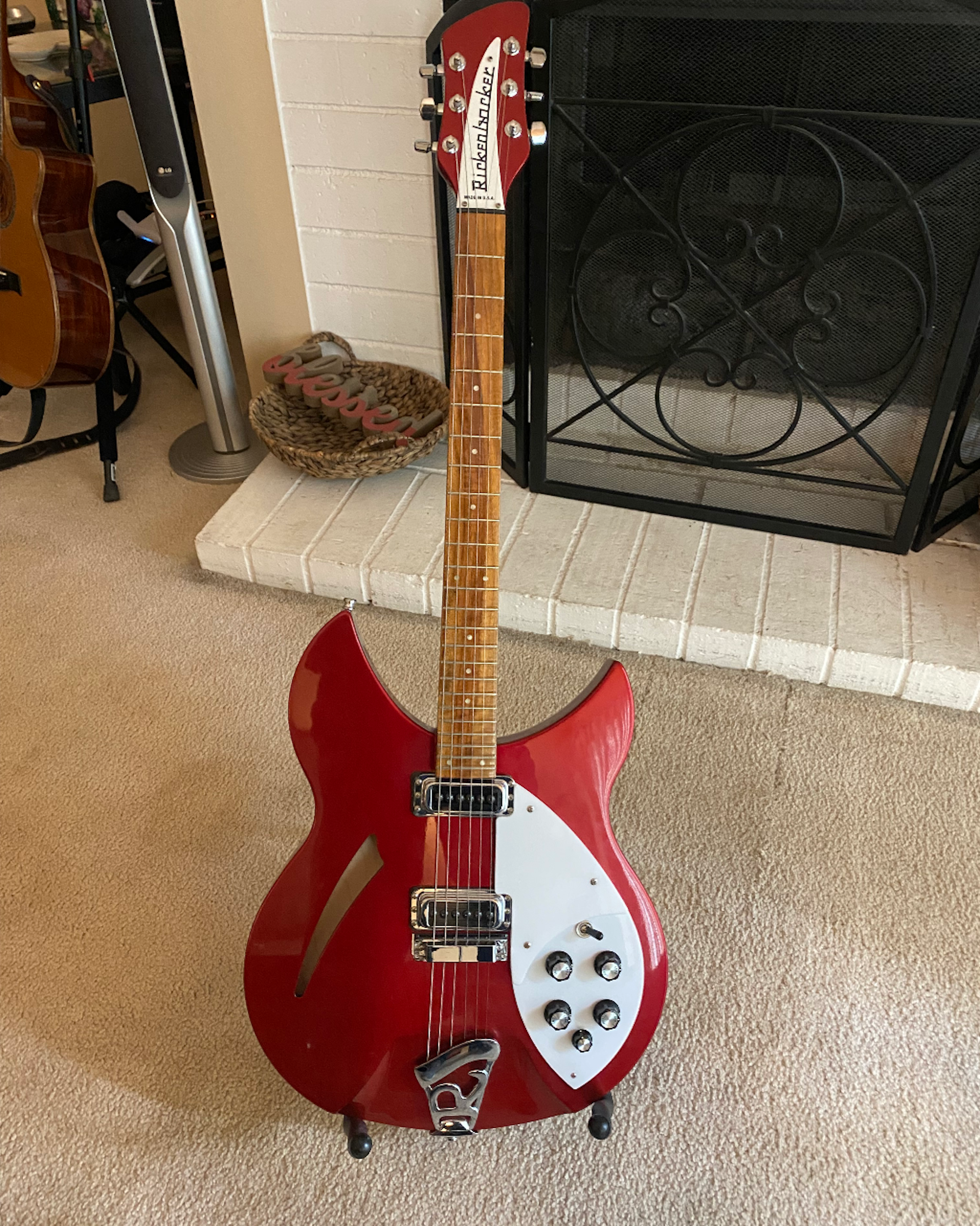 The body is maple. The pickups are single-coil Rickenbacker Hi-gain units, which is a specific thing. They're not hot by modern standards. They're not trying to sound like a Les Paul or a Strat. They sound like themselves, and if you're buying a 330, you're buying because you want that particular voice.